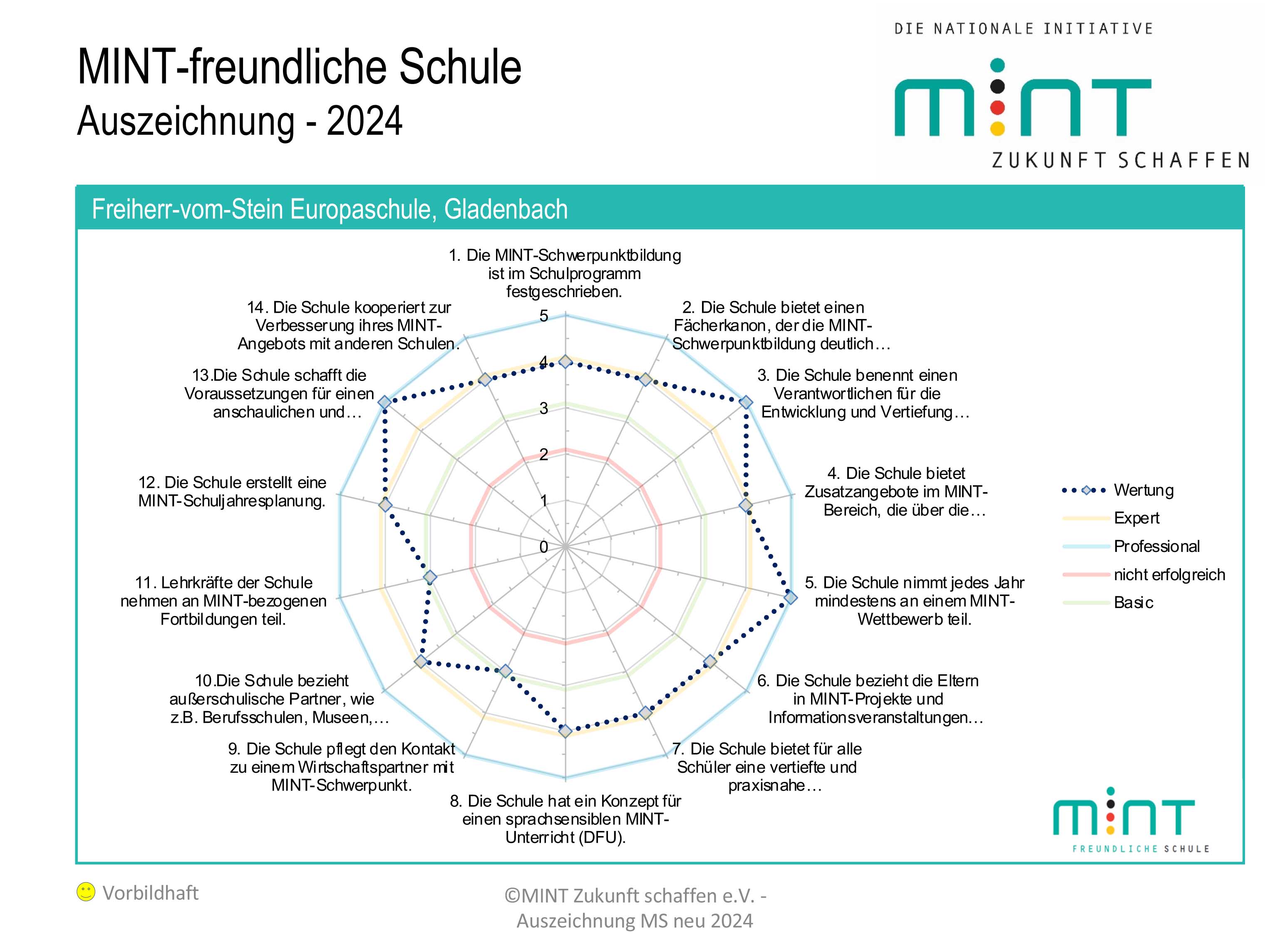 Diese nationale Initiative setzt sich gemeinsam mit vielen Unterstützern für die Förderung von MINT-Bildung in Deutschland ein. Nach der erfolgreichen Bewerbung in allen 14 Kriterien wurde die Europaschule Gladenbach in diesem Netzwerk aufgenommen und profitiert nun von den Vorzügen, wie breiter Vernetzung, regionalen Angeboten und einer qualitätsvollen Profilbildung im Bereich Mathematik, Informatik, Naturwissenschaften und Technik (Beitrag).
