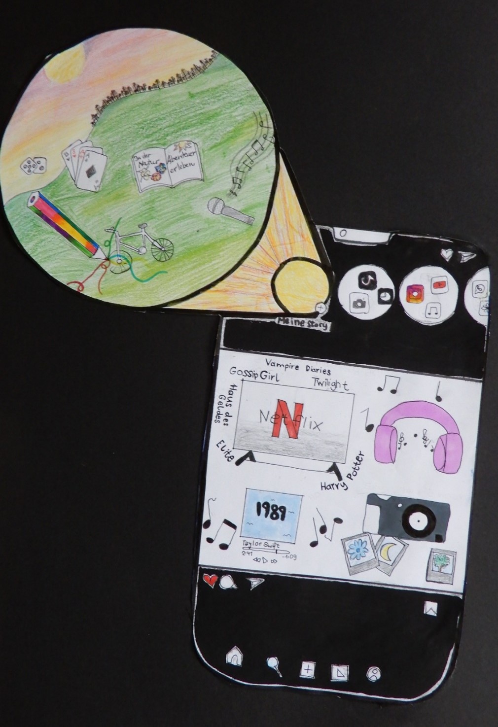Die Klasse 9G3 entschied sich für das Thema „Das digitale Ich“ aus Modul 3 und stellte auf kreative Weise dar, wie sich das Online-Leben und das Offline-Leben beeinflussen.
