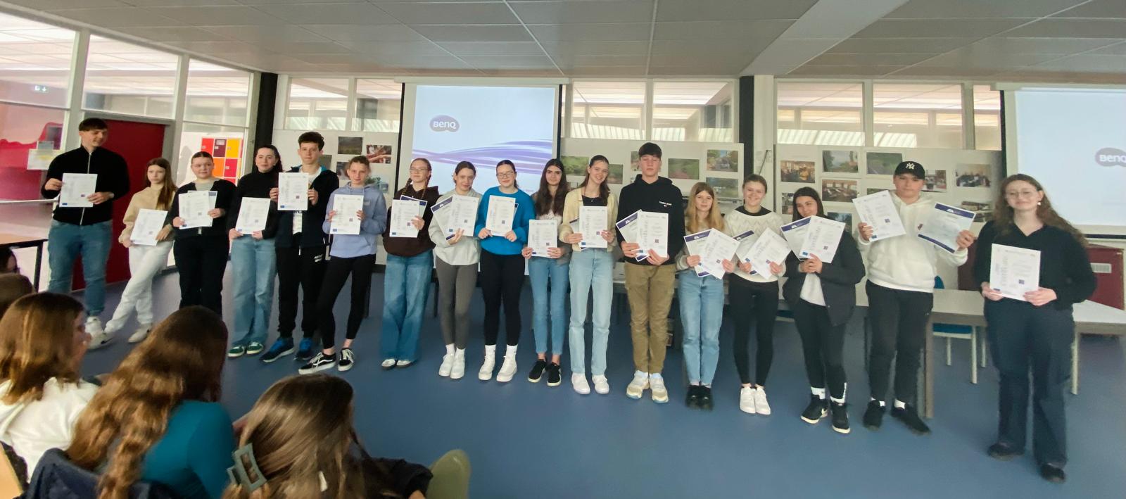 Vom 22. bis 26.04.2024 besuchten Gäste aus Spanien und Slowenien unsere Europaschule im Rahmen des Erasmus-Plus-Projekts „Digital me“. Geleitet und vorbereitet wurde der Besuch von unserer Englisch-/Physik-Kollegin und Erasmus-Beauftragten Isabell Youngkin und unserem pensionierten Kollegen Wolfgang Borschel. Während der gemeinsamen Woche beschäftigten sich alle intensiv mit spannenden Zukunftsthemen. Insgesamt 13 Schülerinnen nahmen aus unserer Schule daran teil: fünf Schülerinnen aus der 9G2, vier Schülerinnen aus der 9G3 sowie vier Schülerinnen aus der 10G2.