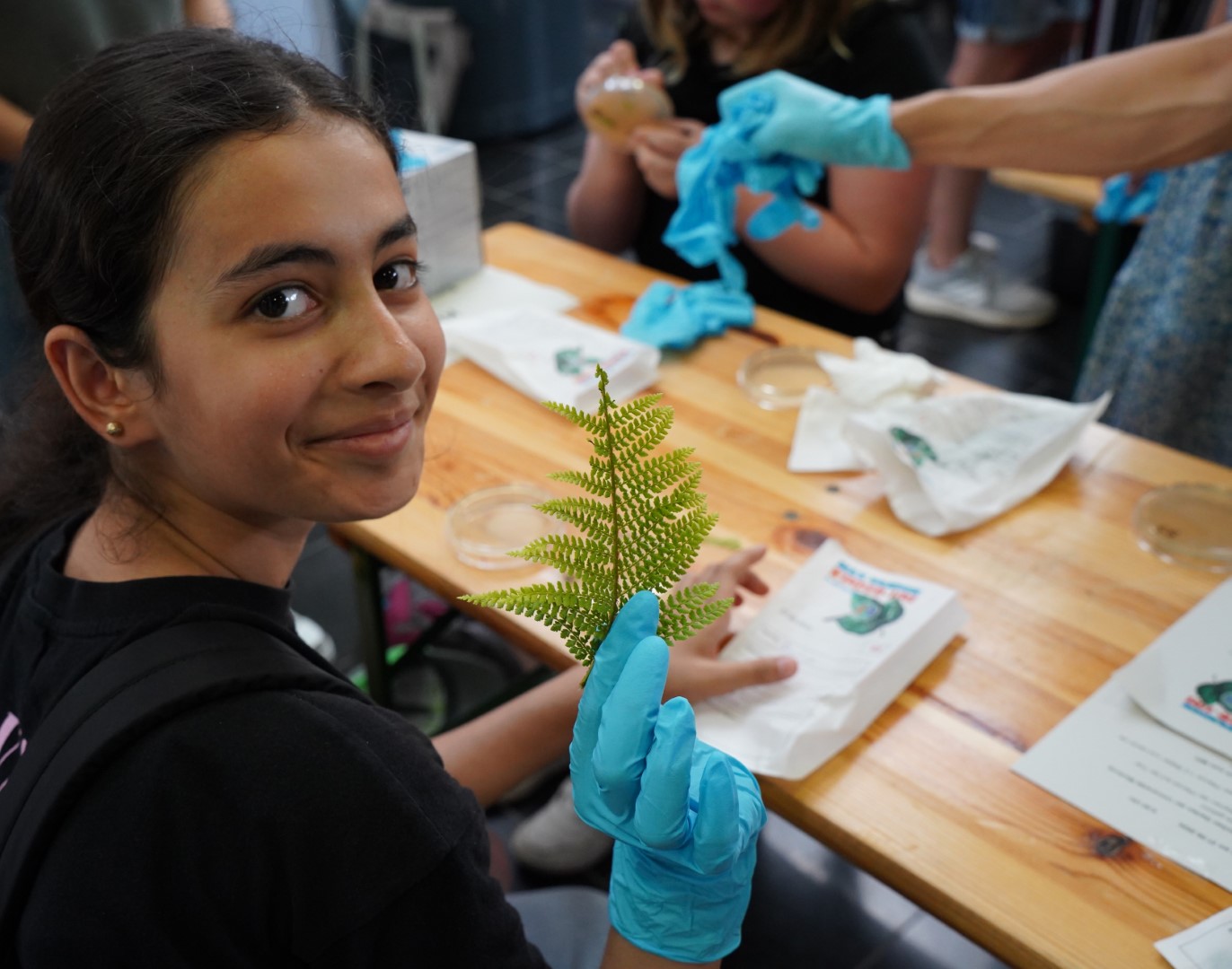 Dort nahm jedes Kind eine Pflanzenprobe im Außengelände. Sorgfältige Handhabung und Beschriftung waren wichtig, denn jede einzelne Probe wurde anschließend im Foyer des MPI „abgeklatscht“, das heißt auf spezielles Nährmedium gedrückt, um die Bakterien von der Blattoberfläche zu isolieren.