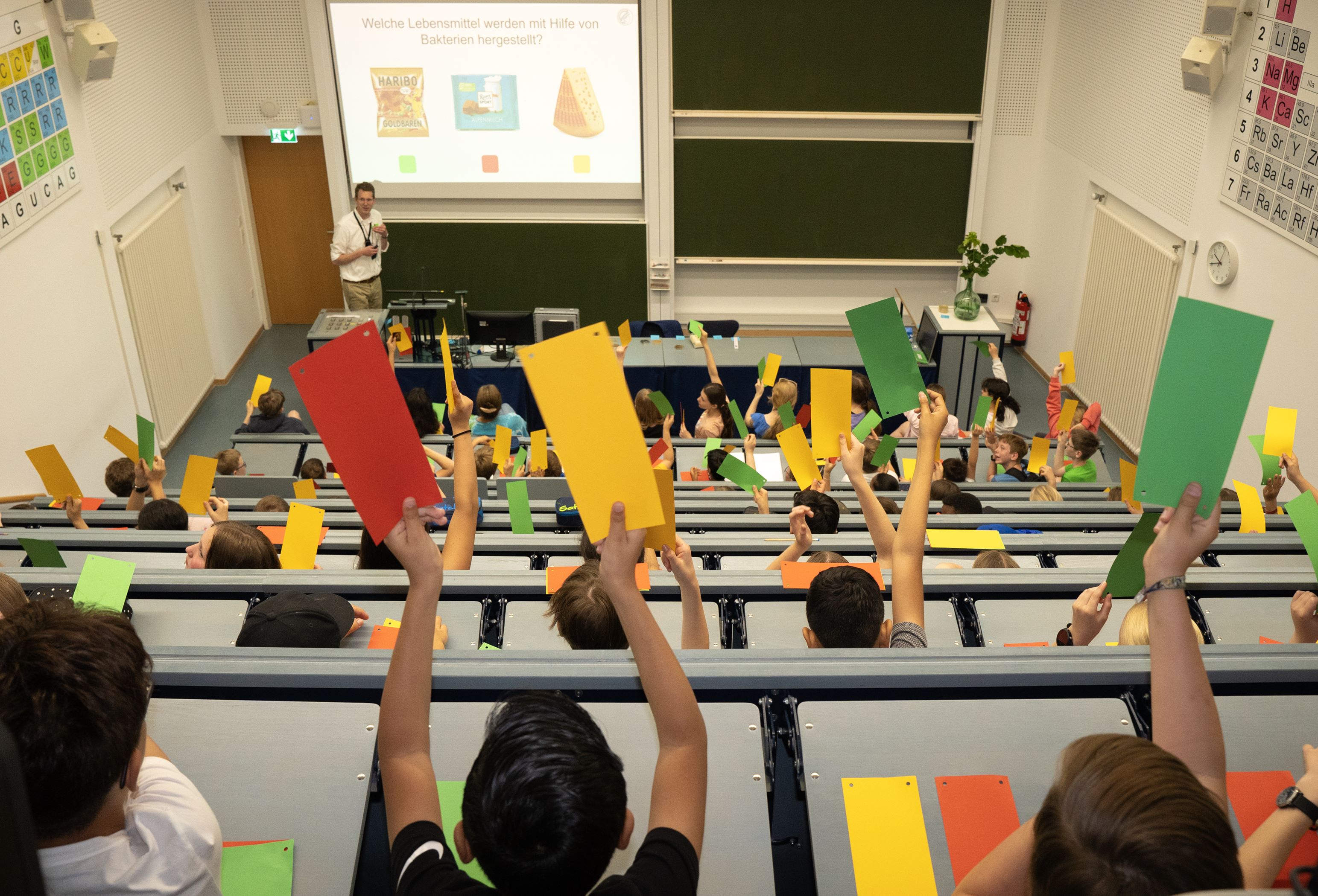 Den Auftakt zur Kinder-Uni bildete eine Vorlesung, gehalten von Prof. Dr. Helge Bode, Direktor am Marburger MPI. Helge Bode erklärte, wie klein Mikroben sind, wo sie vorkommen und warum sie so wichtig sind. Die Schülerinnen erfuhren, dass jede Person mindestens ein Kilo Mikroben auf und im Körper mit sich trägt, schätzten durch Zuruf, wie lange Bakterien schon auf der Erde sind und nutzten begeistert die bunten Abstimmungskarten, um Fragen zu beantworten.