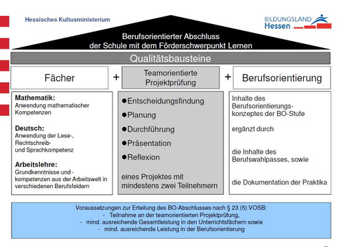 1. Stufe (1 Jahr): Kennenlernen von mind. 2 Berufsfeldern; Betriebspraktika. Prüfung am Ende der Stufe 1 zum Erlangen des Hauptschulabschlusses.
